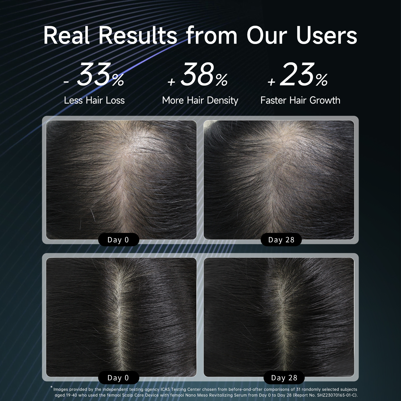 *Images provided by the independent testing agency ICAS Testing Center chosen from before-and-after comparisons of 31 randomly selected subjects aged 19-40 who used the femooi Scalp Care Device with femooi Nano Meso Revitalizing Serum from Day 0 to Day 28 (Report No. SHZ23070165-01-C).